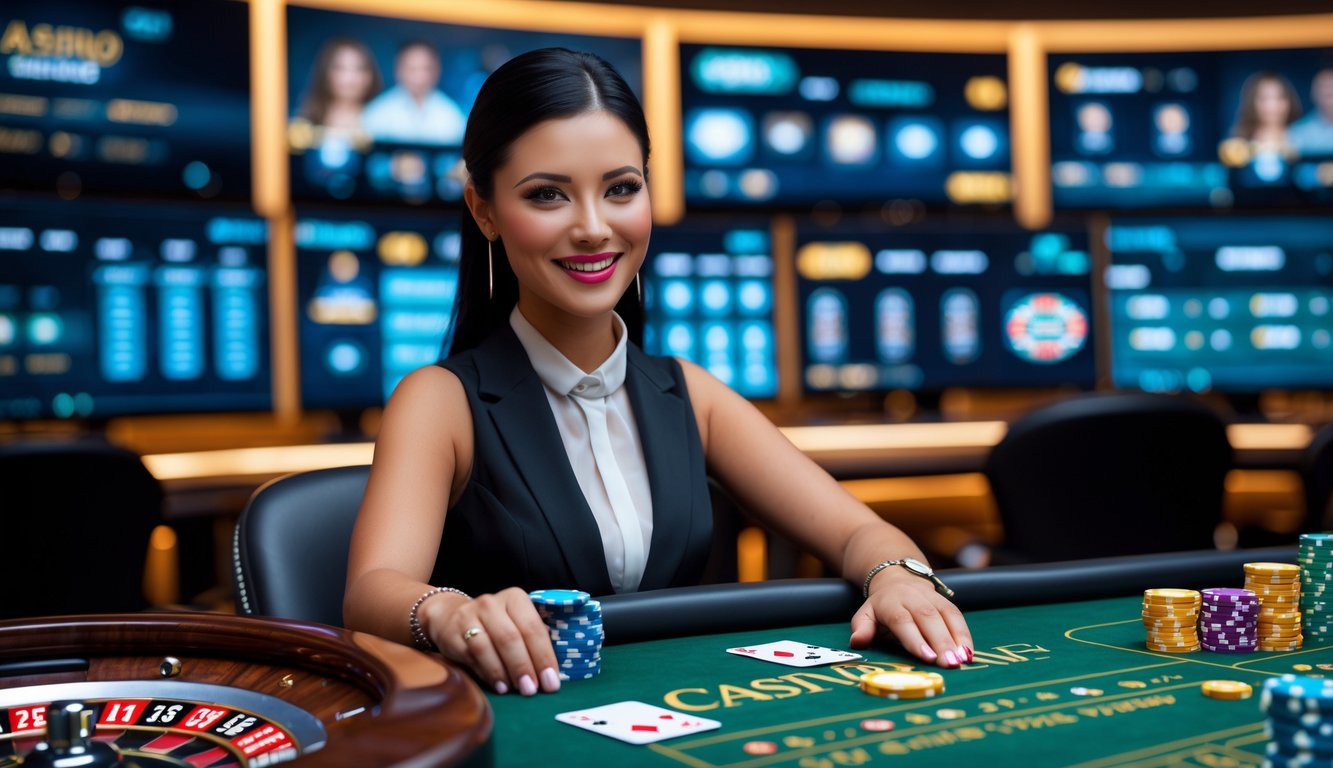 Seorang dealer wanita duduk di meja kasino dengan kartu dan chip, dikelilingi oleh layar yang menampilkan permainan kasino langsung.